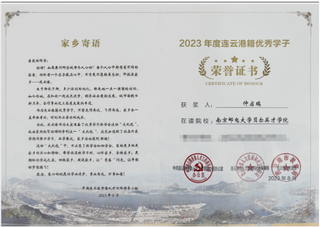 仲启瑞同学凭借出色的学业成绩、卓越的科研创新能力以及积极参与各项校园工作,充分展示了南邮学子卓越的学习能力和责任意识,践行着服务社会、回馈人民的初心与使命。他将继续在人工智能图像处理领域深耕,致力于为国家的科技创新和社会发展贡献具有南邮风采的智慧与力量。