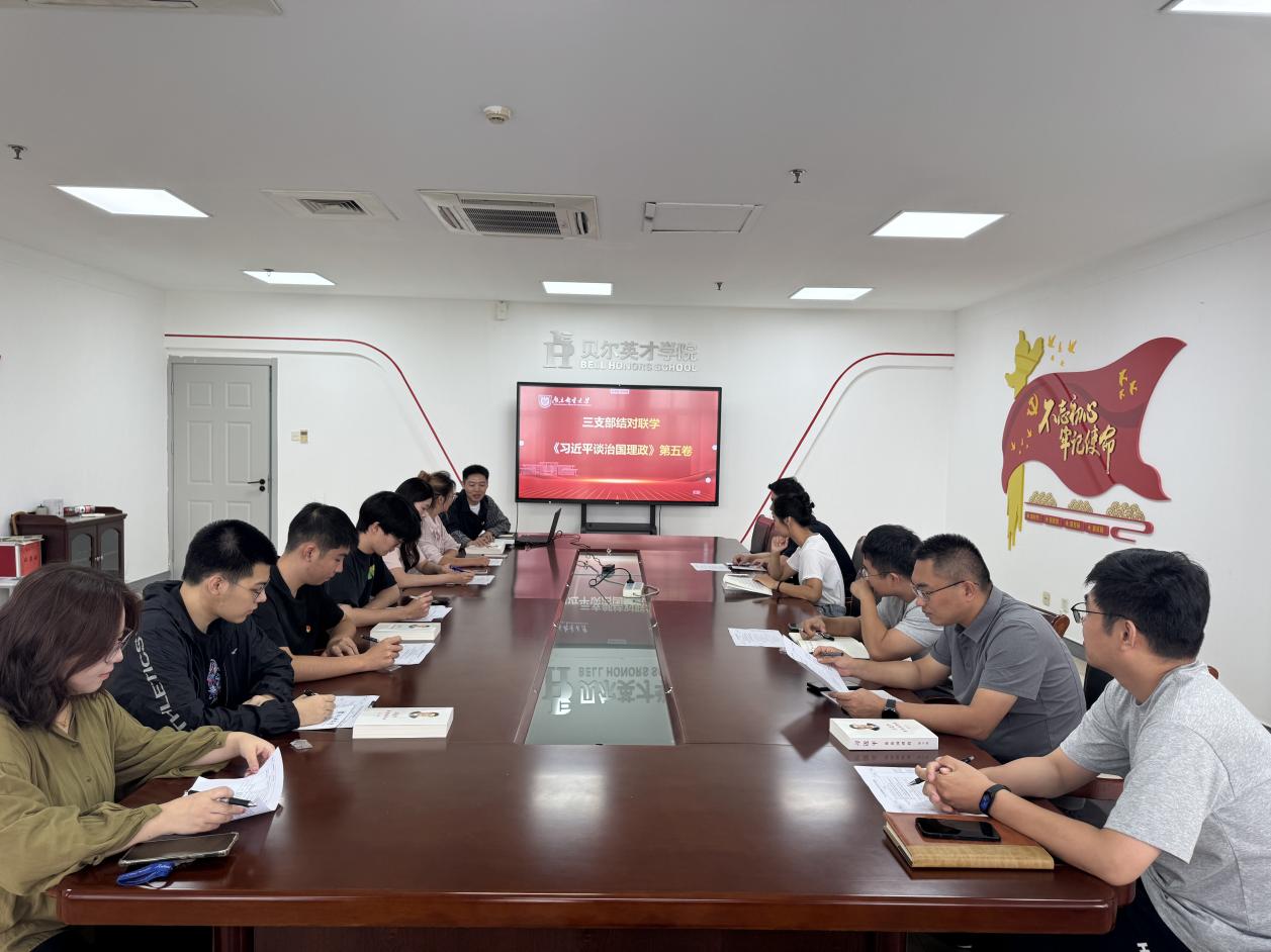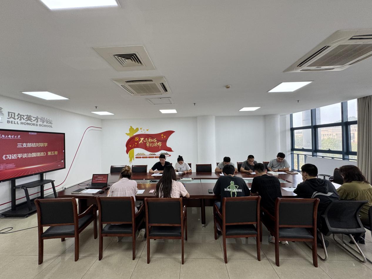 2025年10月17日下午,贝尔英才学院学工党支部、贝尔英才学院教工党支部与创新创业教育学院教工党支部在圆楼319会议室联合开展《习近平谈治国理政》专题学习会第一次学习。各支部师生党员参加了学习,活动由贝尔英才学院学工党支部书记卢老师主持。