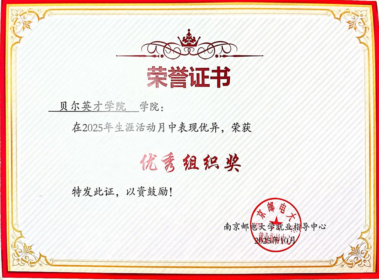 为深入学习党的二十大精神,认真贯彻学校第四次党代会精神,落实“就业优先”战略部署,全面加强就业指导,推动校企供需对接,帮助学生明确未来职业规划,提高学生就业竞争能力,全力促进我校毕业生高质量充分就业,根据教育部、省教育厅相关工作要求,学校举办了2025年南京邮电大学“生涯活动月”系列活动,贝尔英才学院积极组织学生参加“生涯活动月”系列活动,取得优异绩。