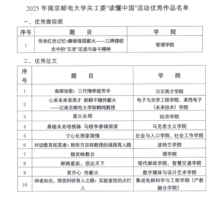 近日,南京邮电大学2025年“读懂中国”活动优秀作品名单正式公布,贝尔英才学院关工委推送的征文《南邮弦歌:三代情牵绽芳华》凭借深刻的主题内涵、真挚的情感表达与扎实的文字功底,成功获评“校级优秀征文”。